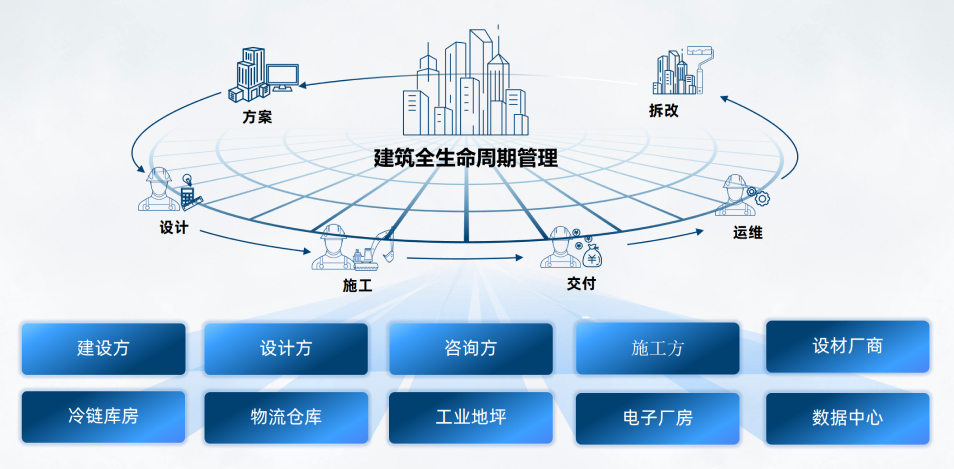 围绕工程项目全生命周期的业务领域——基于冷链库房、物流仓库、工业地坪、电子厂房、数据中心等细分领域,面向建设方、设计方、咨询方、施工方、设材厂商等产业链各参与方,为建设单位提供方案、设计、施工、交付、运维、拆改等需求的建筑全生命周期数字化管理。